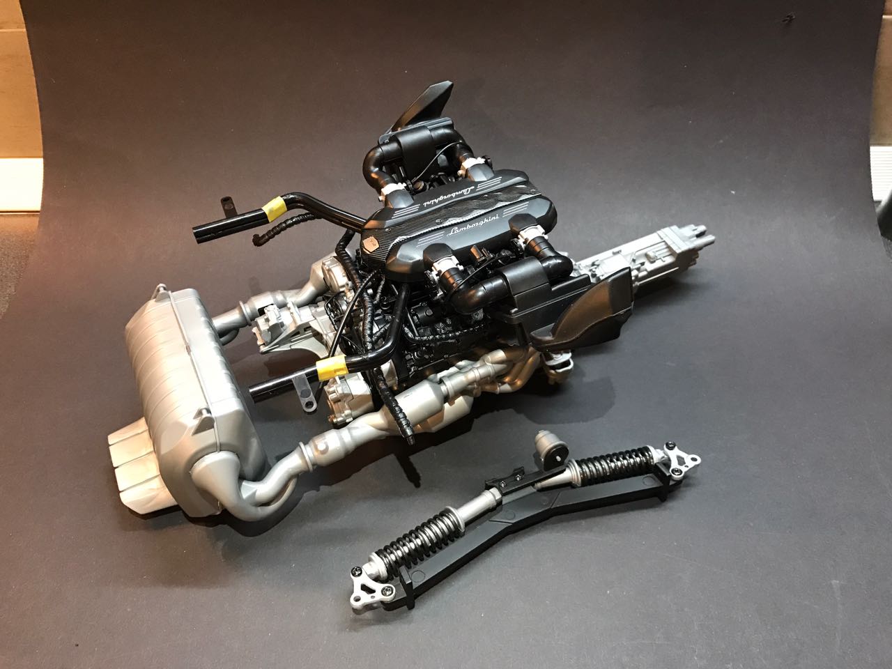 Комплект состоит из 796 деталей, изготовленных из различных материалов, включая металл, резину, текстиль и пластика премиум качества. Рулевое управление, подвеска и механизм спойлера функционируют наряду с открывающимися дверями, капотом и багажником. В собранном виде модель впечатляет своим размером - 595мм х 287мм х 144мм.